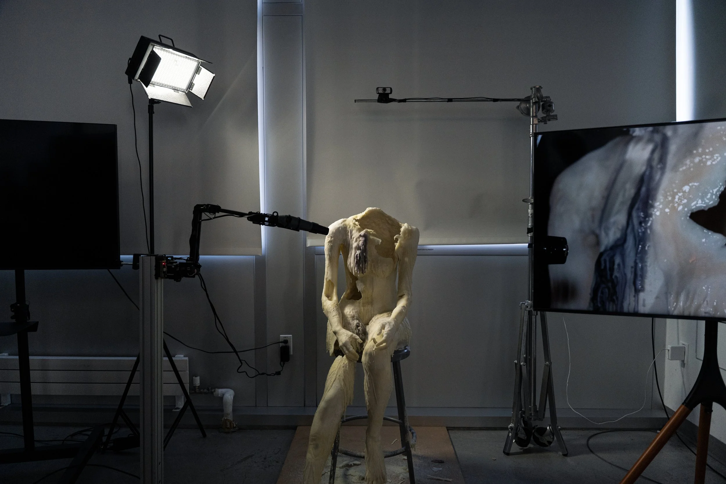 Don’t Look At Me, 150 x 250 x 150 cm; Wax, robotic arm, heat gun, camera, mix material; 2025